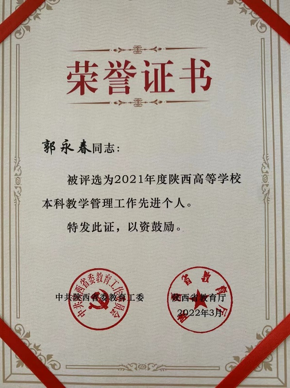 beat365官网郭永春同志被陕西省委教育工委评选为2021年度陕西高等学校本科教学管理工作先进个人。表彰他在2021年度的工作表现。