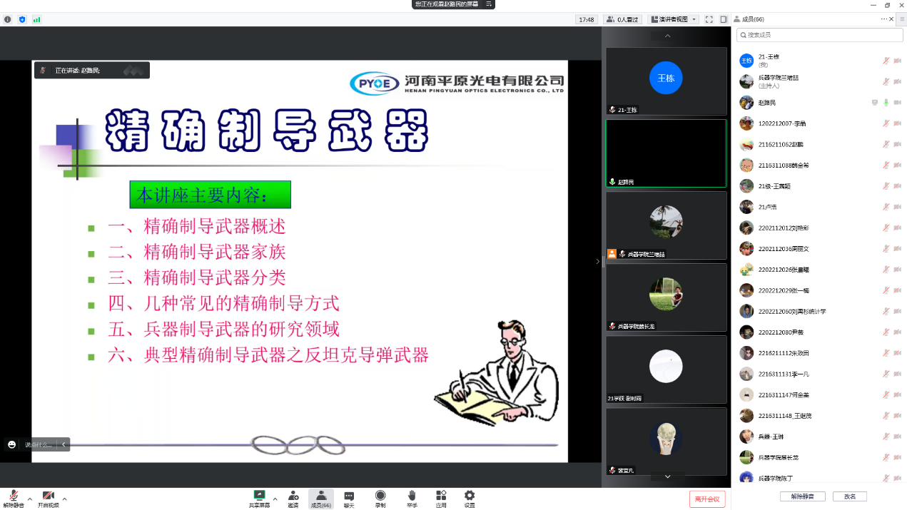 2022年12月2日上午9:30,河南平原光电有限公司赵路民研高工应邀为beat365官网作题为“精确制导武器系统”的线上讲座。本次讲座由教学院长蔡长龙主持,院长郭永春、学院教师及全体研究生参加讲座。