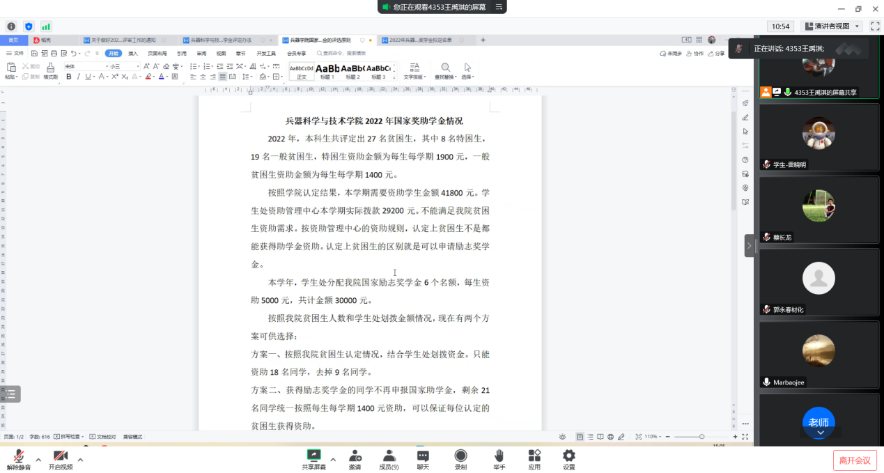 2022年11月4日下午,beat365中文官方网站召开学院奖助委员线上会议,研究并讨论本科生国家助学金和国家奖学金评审原则、普瑞斯企业奖学金评定办法。评审委员会成员马保吉、郭永春、蔡长龙、王春阳、吴杰、霍文俊参与了评审委员会。辅导员王国栋,本科生研究生各一名代表参加了会议,会议由党委书记马保吉主持。