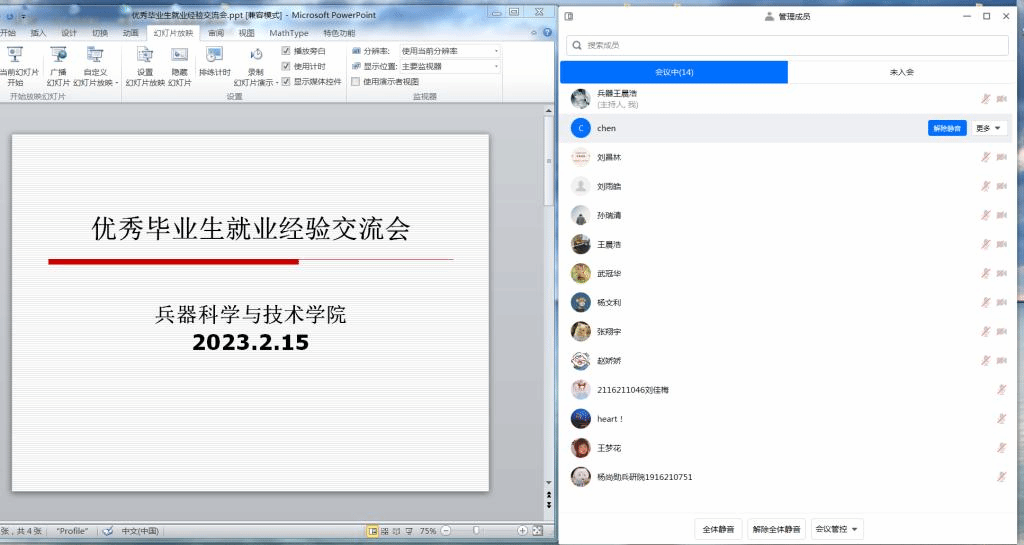 为了帮助低年级研究生提高职业生涯规划能力,助力2023届毕业研究生找到心仪的工作,兵器学院于2月15日开展了朋辈帮扶就业指导经验交流会,邀请了2022届毕业研究生校友王梦花、杨尚勋分享就业经验,全体硕士研究生及研究生辅导员王晨浩参加了会议。