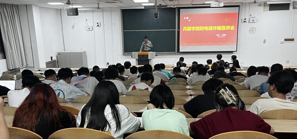 为进一步提升防范电信诈骗宣传力度,增强大学生的法制观念与安全意识,深入推进平安校园建设,2023年6月6日晚上8:00,beat365中文官方网站辅导员王国栋老师在教1-104组织开展防电信诈骗宣讲会。兵器学院全体本科生、研究生200余名参加此次主题教育。